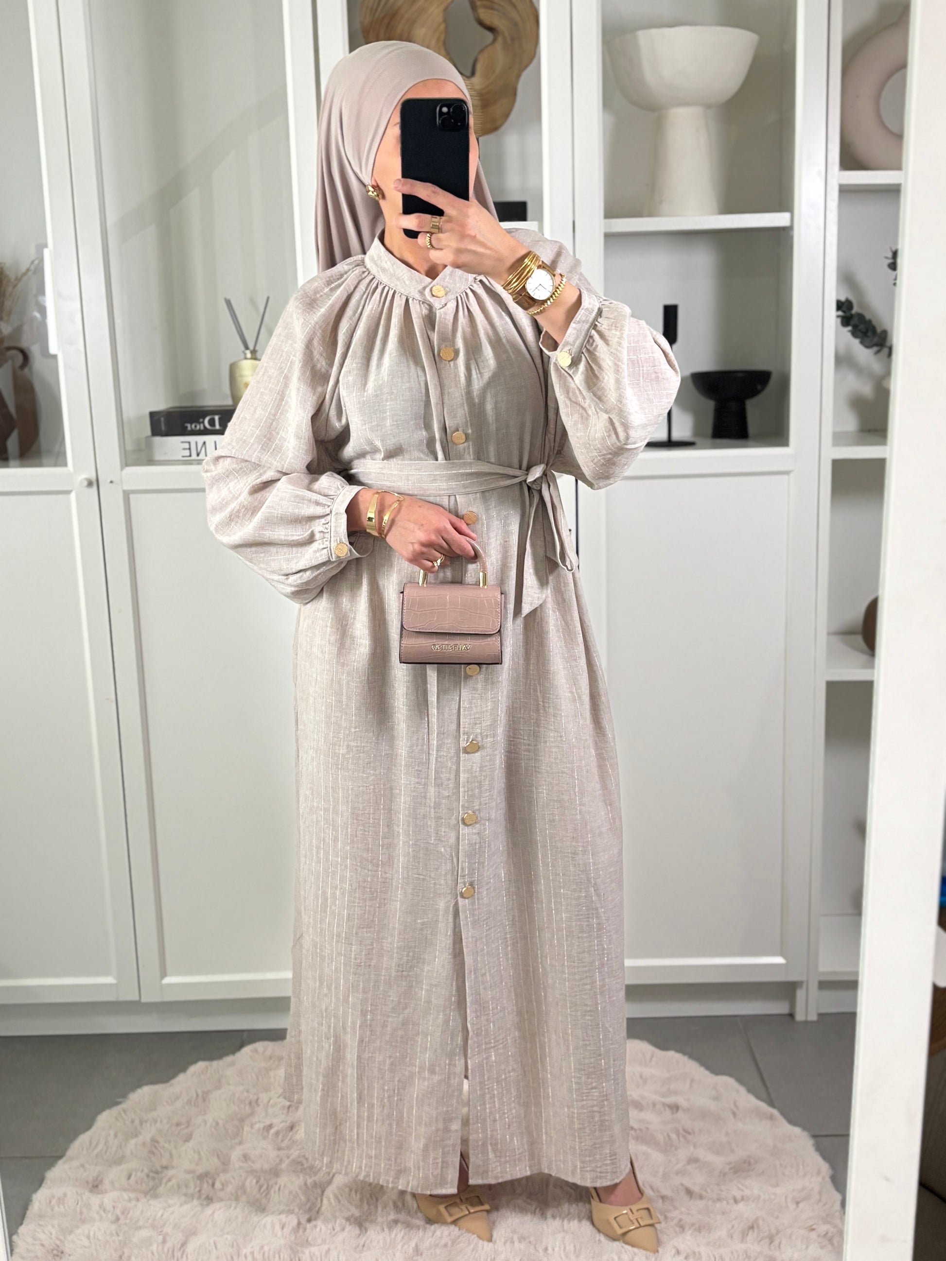 Robe Élégante rendu effet Lin d'un beige doux, avec boutons dorée.