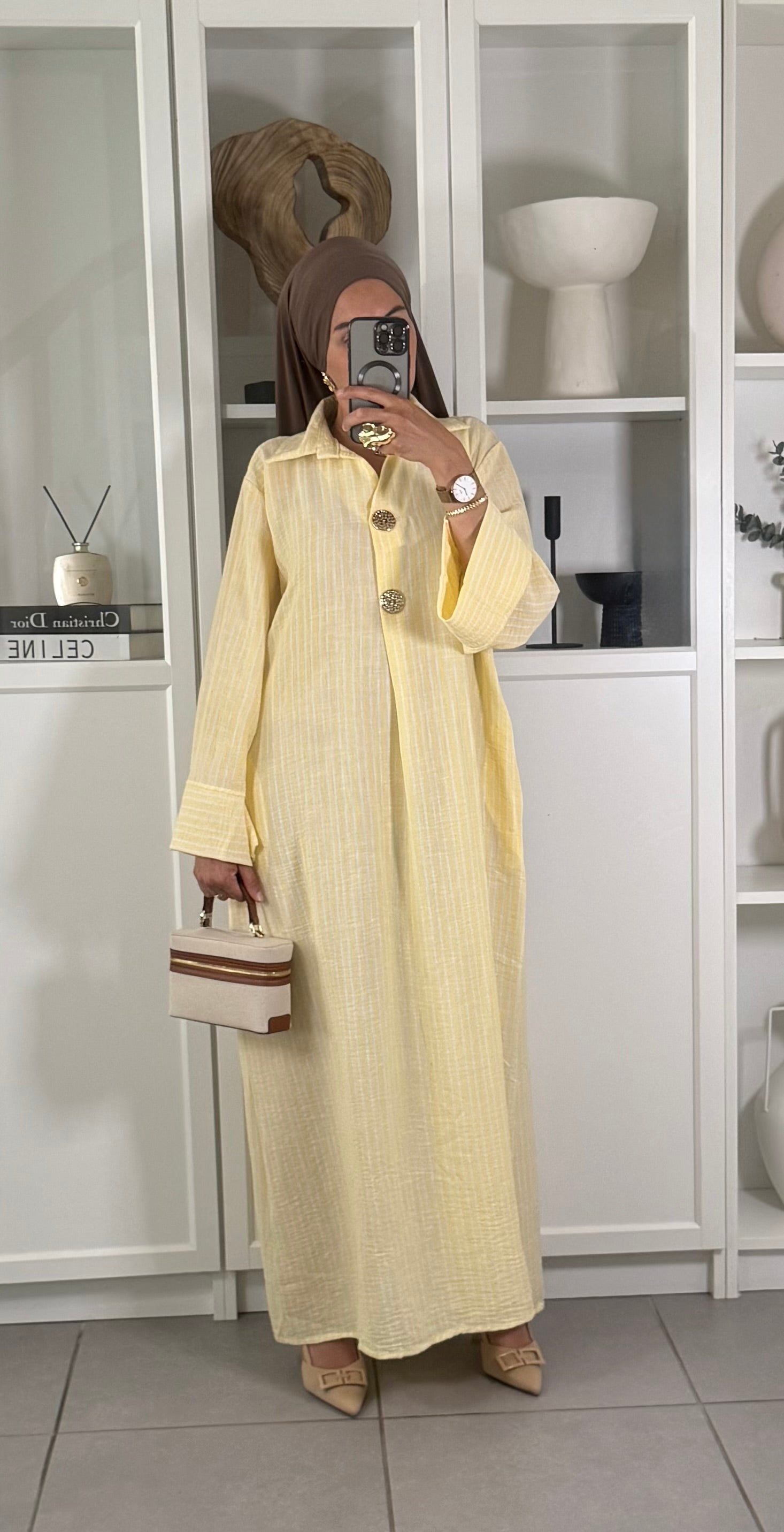 Craquez pour cette robe longue en tissu gaufré jaune pastel, parfaite pour les beaux jours. Légère, fluide et confortable, elle séduit par ses détails soignés comme ses larges manches et ses boutons décoratifs dorés. Son tombé droit et ample en fait une pièce à la fois élégante et décontractée, idéale pour un style modeste chic.